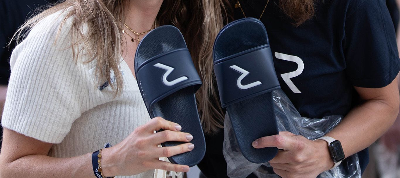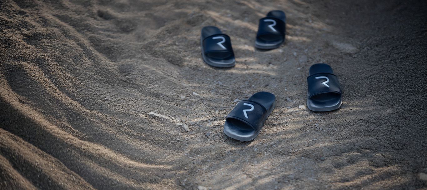 - Badeschlappen: Navy, mit weißem R auf der Schuhbrücke und „Roddayaner“ außen auf der Seite